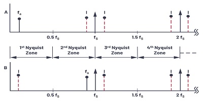 奈奎斯特帶寬定義為從直流到fS / 2的頻譜。頻譜被劃分為無數(shù)個奈奎斯特區(qū),每個區(qū)的寬度等于0.5fS。實際上,理想的采樣器由ADCFFT處理器代替。FFT處理器僅提供從直流到fS / 2的輸出;也就是說,出現(xiàn)在第一個奈奎斯特區(qū)域中的信號或別名。