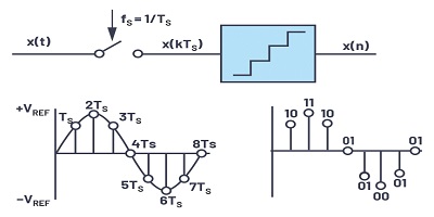 數(shù)據(jù)的數(shù)字化涉及采樣和量化的兩個基本過程,如圖1所示。采樣是第一步,其中使用采樣將連續(xù)時間變化的模擬信號xt)轉(zhuǎn)換為離散時間信號xn)。頻率fS。結(jié)果平均間隔為1 / TSfS = 1 / TS)。