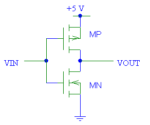 參考上面的CMOS反相器圖,由于CMOS器件輸入端的電壓在5伏和0伏之間變化,因此PMOS和NMOS的狀態(tài)將相應(yīng)地不同。因此,如果將每個(gè)晶體管建模為一個(gè)由VIN激活的簡(jiǎn)單開關(guān),那么毫無疑問,我們可以看到CMOS反相器的功能。