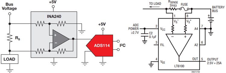 以上電路是高端電流檢測(cè)技術(shù)的實(shí)際示例。左圖使用的是德州儀器(TI)的INA240,并將輸出提供給ADC,該ADC將以I2C協(xié)議提供數(shù)據(jù)。右圖使用的是ADI公司的LT6100。它與負(fù)載的保險(xiǎn)絲一起檢測(cè)高端電流。